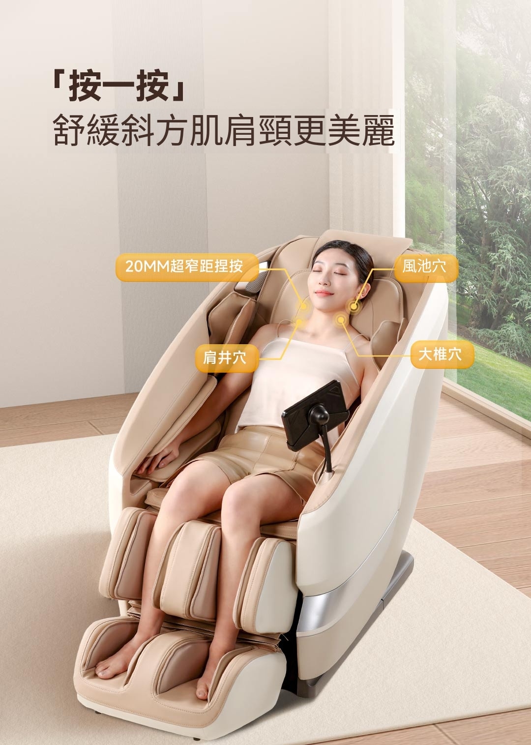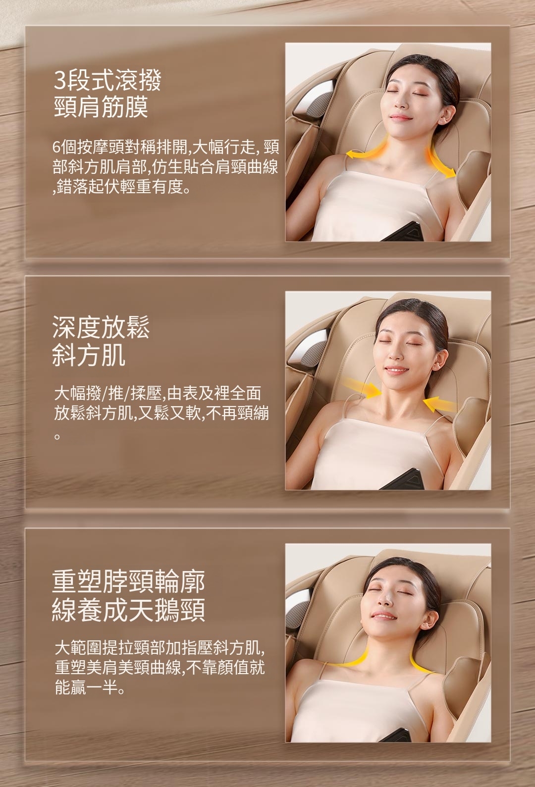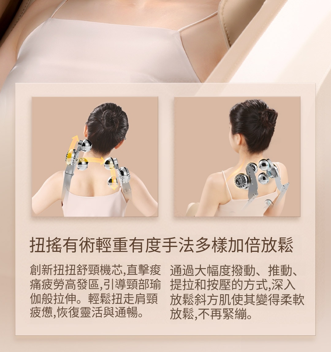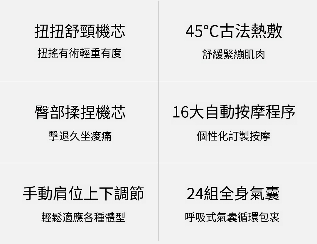 - 多功能按摩: 提供全方位的肩頸、背部及腰部按摩,針對斜方肌等肌肉群進行深層放鬆。
