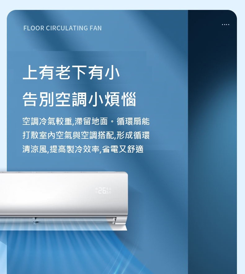 空調冷氣較重,滯留地面。循環扇能