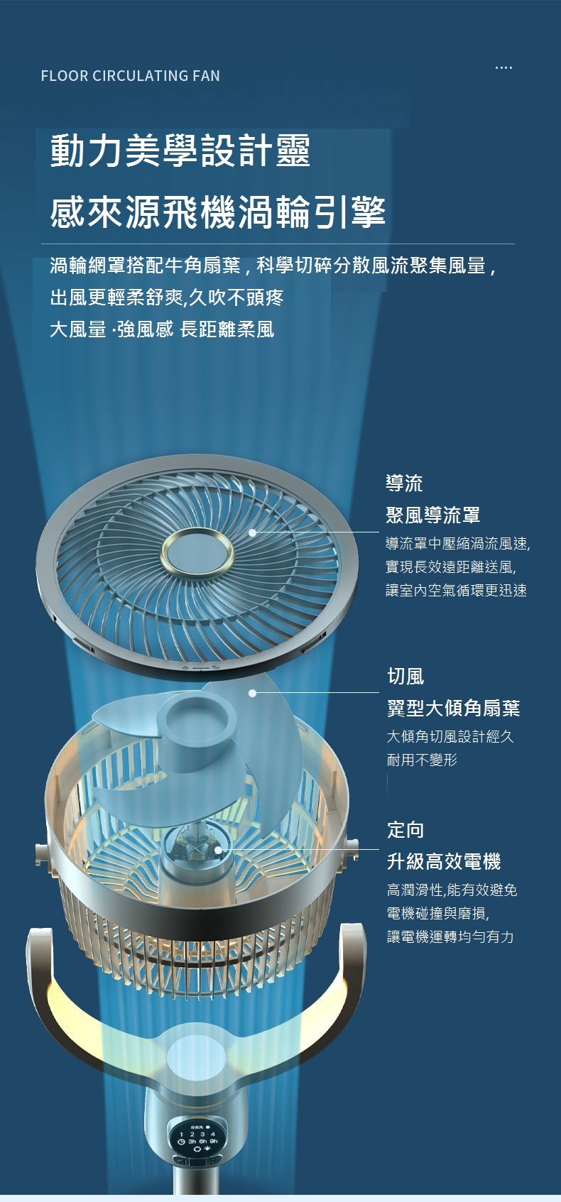 渦輪網罩搭配牛角扇葉 , 科學切碎分散風流聚集風量 ,